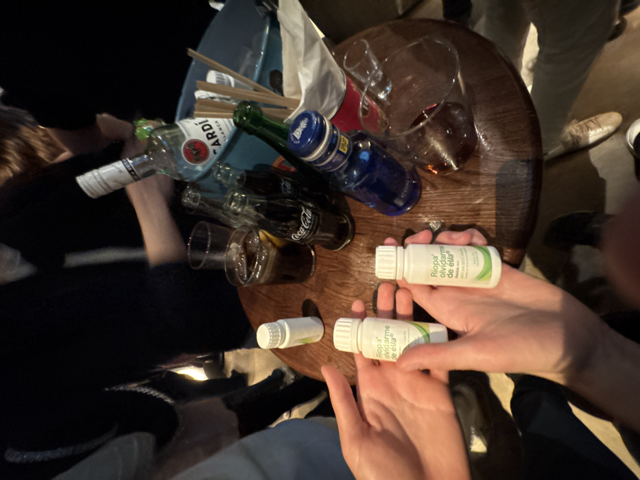 A slightly aerial view shows a round wooden table littered with empty Bacardi and Coca-Cola bottles, along with various glasses, some containing liquid. The edge of a blue bin is visible. Two hands hold small white bottles labelled "Riopa olvidarme de ella." Individuals are seated around the table, and a person wearing tan pants and white shoes stands to the right. The image appears to capture a social gathering or party with alcoholic beverages.