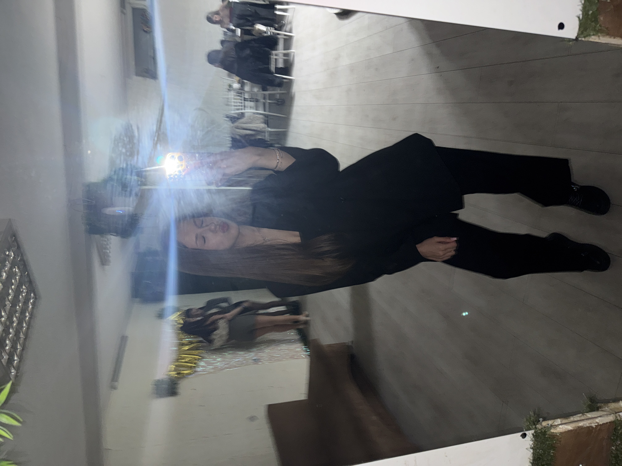 A woman is posing in front of a mirror indoors. The location appears to be a restaurant or event space with tables and chairs visible in the background of the mirror. Additionally, there is a person also visible in the background on the right of the mirror. The mirror reflects additional people, party decorations, and interior details. It's not possible to confirm the location in Ruse, Bulgaria with the available information.