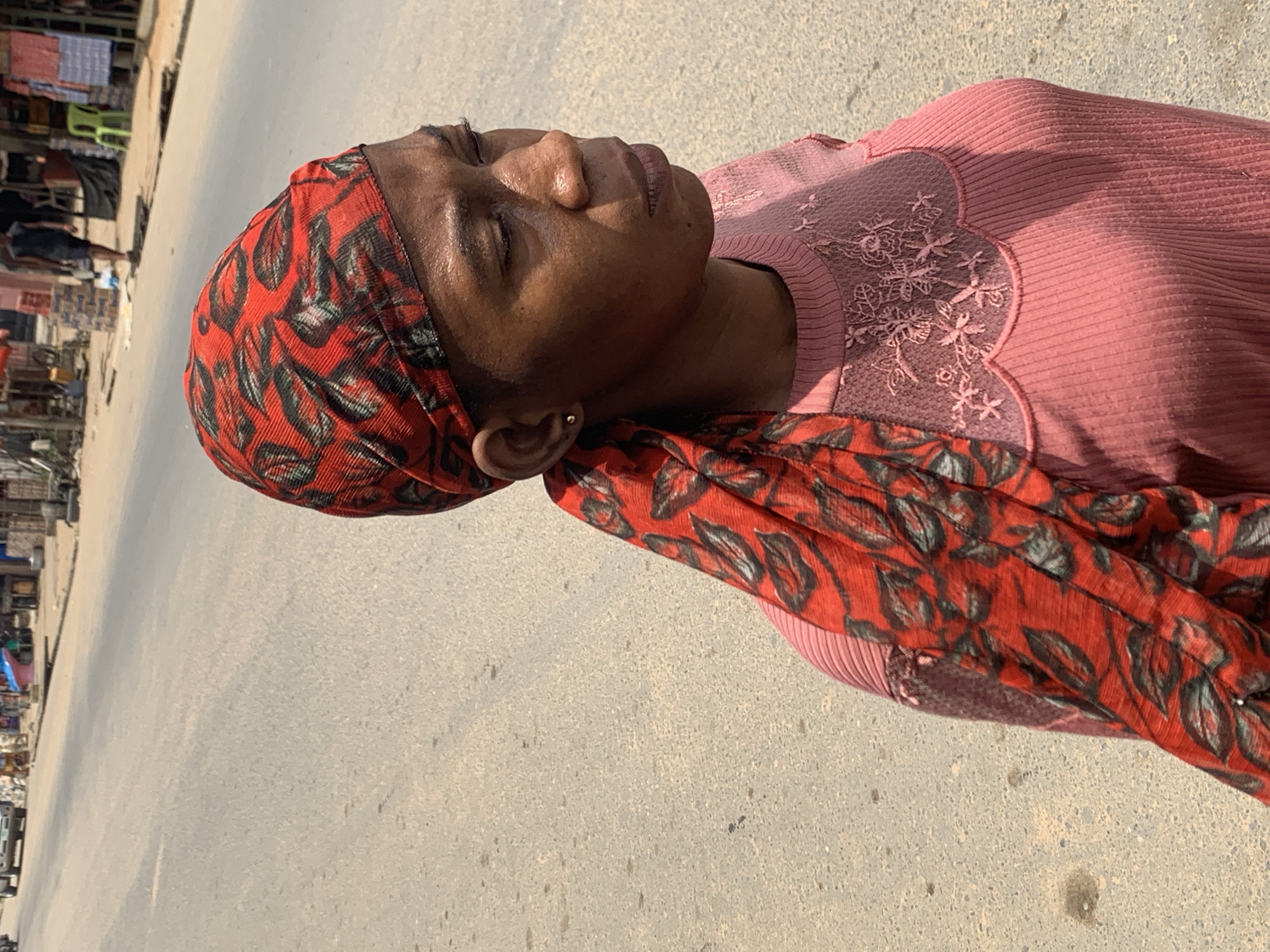 The image displays a street scene in Umuode, Nigeria, under bright daylight conditions. The primary subject is an adult female, positioned in the foreground and shown from the mid-chest upward, angled slightly to her right with her gaze directed downwards. Her complexion is dark, and her face exhibits signs of perspiration. She wears a red headscarf adorned with a pattern of dark green and black leaves, which is wrapped around her head and drapes over her left shoulder. A small, gold-colored stud earring is visible in her left earlobe. She is dressed in a pink, long-sleeved, ribbed top featuring a lighter pink, semi-transparent lace overlay with embroidered floral patterns around the neckline. The background reveals a light grey asphalt road extending into the distance, appearing dry and dusty. Along the right side of the road, a series of informal structures or market stalls are visible, displaying various items. A bright green plastic chair is positioned outside one of these structures. A single individual in dark clothing walks away from the camera further down the road on the right. A light-colored vehicle is partially discernible in the far background on the left side of the road.