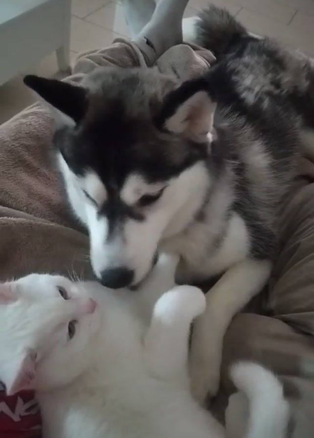 A close-up shot shows a person lying on a bed, with a gray and white husky lying on their legs. A white cat lies on the person's stomach. The husky licks the cat's face, and the cat stretches out its paws toward the dog. The room is tidy, with a white side table and a pair of black shoes visible in the background. The person's legs, clad in gray socks, are also in the frame.