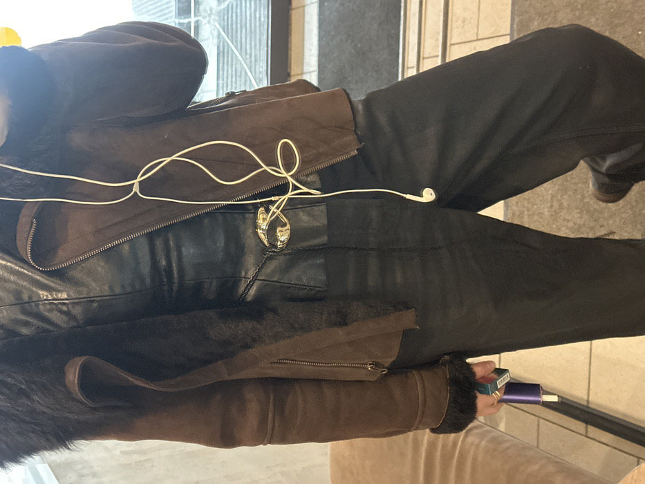 An individual, viewed from the mid-chest down, stands indoors in Moscow, Russia. The person wears an open dark brown shearling jacket with dark fur trim on the collar and cuffs, revealing a zipped-up black leather-like top or vest. Black trousers and dark footwear are visible, with one shoe's toe area present on the right. A gold-toned, abstractly designed belt buckle or clasp, attached to a braided black strap, is prominent at the waist. White wired earphones with a dangling earbud are draped over the individual's torso. In the left hand, a purple and white electronic device, likely a vape pen or e-cigarette, is held alongside a small, rectangular package. The immediate environment consists of a light-colored tiled floor. To the left, a section of a beige upholstered bench is visible. To the right, a blurred reflective surface, potentially a glass door, reveals a dark floor mat, indicating an entrance.
