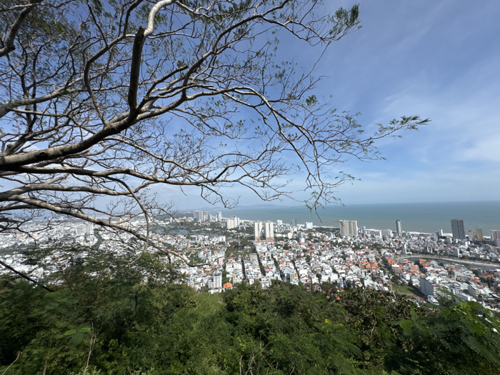 From an elevated viewpoint, a sprawling city meets the sea under a partly cloudy sky. The urban landscape features a mix of low-rise buildings and high-rise towers. Lush green foliage covers the immediate foreground, partially obscuring the cityscape. A large tree with bare branches dominates the upper-left portion of the scene. The sea stretches to the horizon.