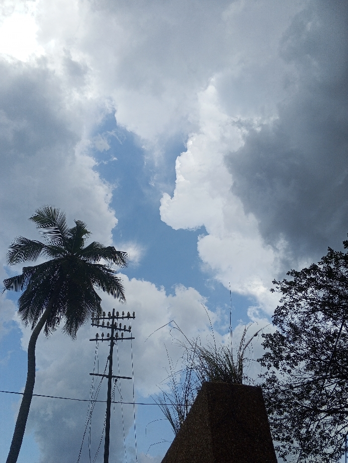 This image depicts an outdoor scene in Konongo, Ghana, dominated by a dynamic sky. Overcast conditions prevail, with a mix of large, dense grey clouds and brighter white cumulus clouds, punctuated by patches of clear blue sky. In the foreground, a tall palm tree with a curved trunk and fanned fronds is silhouetted against the sky on the left. Adjacent to it, near the center, stands a utility pole equipped with multiple cross-arms and insulators, from which several dark wires extend horizontally and vertically. To the right, a dark, textured, possibly concrete or stone structure with a sloped or pyramidal shape is partially visible. Tall, thin blades of grass or reeds sprout from behind or atop this structure. Further right, the dark silhouette of a broad-canopied tree, showing intricate branching, is visible against the lighter parts of the sky. No individuals, specific actions, or interactions are discernible within the frame.