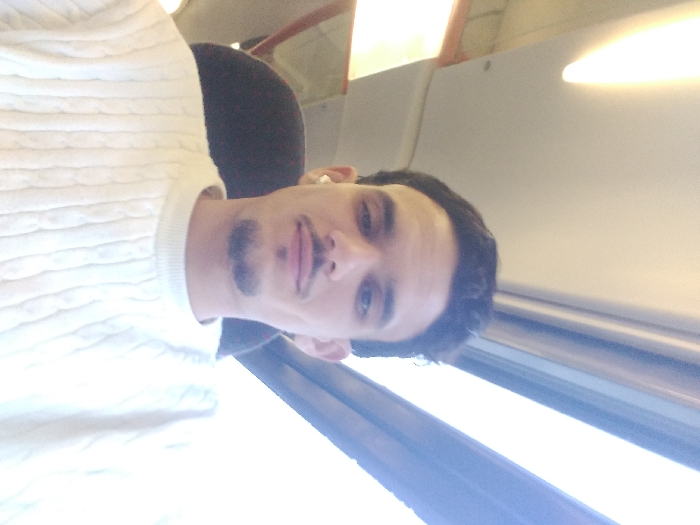 The image displays a male individual, appearing to be taking a selfie. He has dark hair, a mustache, and a goatee, and is wearing a white cable-knit sweater. A single white wireless earbud is visible in his left ear. He is seated, with a dark-colored seatback partially visible behind him. The background indicates an interior environment, consistent with public transportation such as a train or bus, characterized by linear overhead lighting fixtures and a large window on the right side of the frame. The exterior visible through the window is significantly overexposed, preventing the identification of specific landmarks or the precise location within Temara, Morocco.