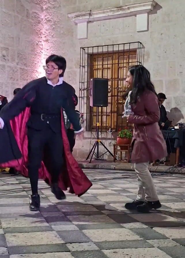 Two people dance in a courtyard. A man in a black jacket, black pants, black boots, and a black cape with a pink lining dances facing a woman in a brown jacket, light-colored pants, and black shoes. The man holds his arms out to the sides and bows towards the woman. She smiles back at him and appears to mimic his movements. Behind the dancers is a musical ensemble consisting of men playing guitars, a trumpet, and an accordion. A speaker and other pieces of electronic equipment are visible near the musicians. A set of window bars stands behind the woman, and the entire scene is set against a stone wall with a checkerboard tile ground.