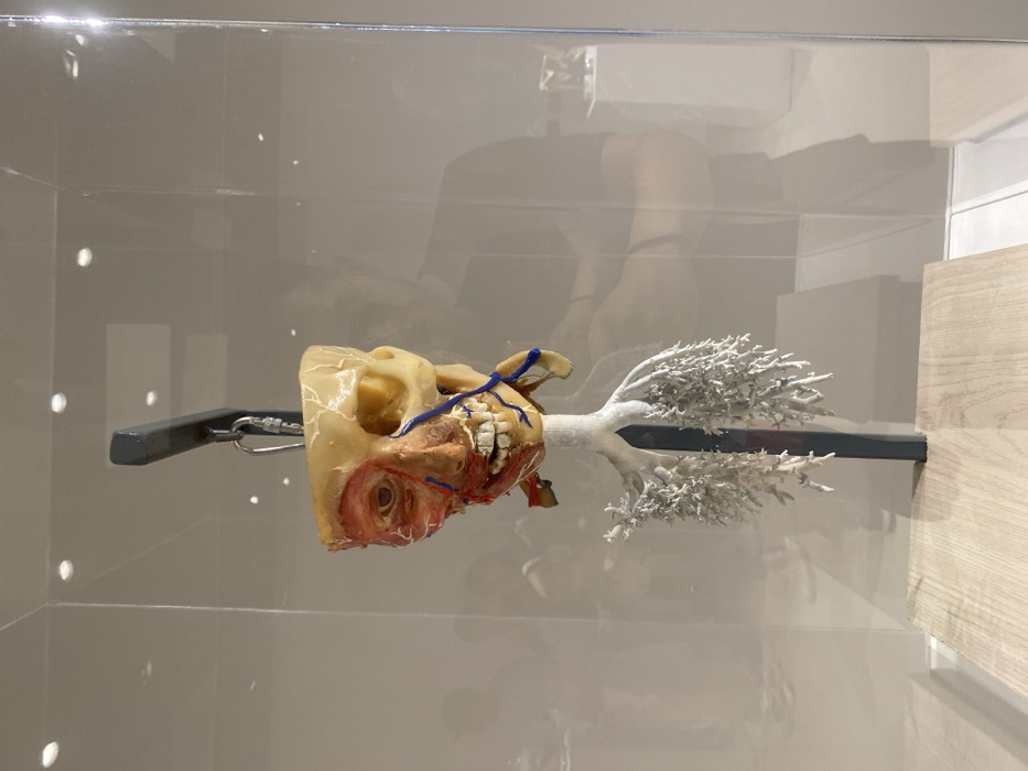 An anatomical display is observed within a clear vertical showcase in Santa Cruz de la Sierra, Bolivia. The central subject is a partial human anatomical model, comprising a head and a segment of the respiratory system. The head is partially dissected, revealing red musculature, an eye, and flesh-toned skin on the right facial area, contrasting with exposed bone (skull) and prominent blue vasculature on the left jaw and neck region. It is suspended from a dark grey angled bar via a silver carabiner clip attached to its crown. A white, branched structure, anatomically consistent with a trachea and bronchial tree, extends downwards from the head. This structure is integrated with a dark grey vertical support, which is affixed to a light-colored wooden pedestal forming the base of the exhibit inside the case. The transparent display case reflects a person wearing a dark short-sleeved top, positioned to the right and facing the exhibit. Additional reflections include ceiling spotlights and faint outlines of other individuals and background architecture. The immediate environment outside the case features light-colored walls and, faintly, another display fixture in the distant right background.