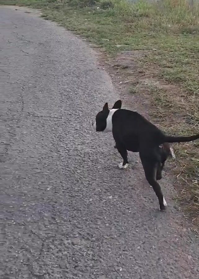 A black and white Bull Terrier is seen from behind, walking up a cracked asphalt road on a hill. The dog has a white patch around its neck and white socks on its rear feet. The road is flanked by green grass and weeds. In the background, rolling green hills meet a cloudy sky. A sign is visible in the distance beside the road. Someone says "Toma." The dog continues walking up the road.