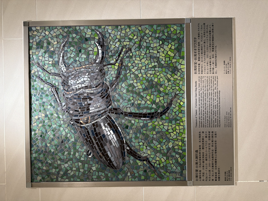 The image is of a mosaic art piece depicting a Formosan Giant Stag Beetle