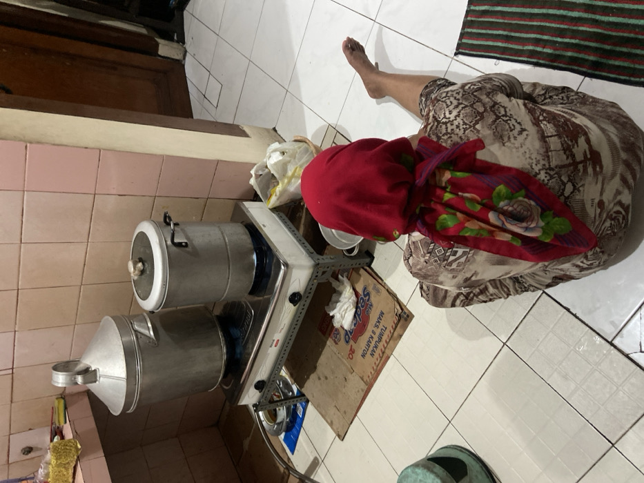 A woman wearing a red headscarf and patterned skirt sits on a tiled floor next to a stove. Two large, silver pots rest on the stove. Beside the stove is a cardboard box. A bare foot extends toward the right side of the frame, near a striped rug. The room has pink and white tiled walls. A wooden cabinet is visible in the background.