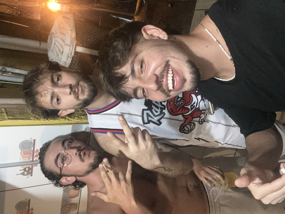 Three young men are posing for a photo. One shirtless man wears glasses and holds a cigarette. Another wears a white jersey with a dinosaur logo. He's flashing a hand sign and smiling broadly. The third man is in the background, partially visible behind the other two. The image is rotated. The background is a mix of indoor and outdoor elements, including a fan and a tiled wall.