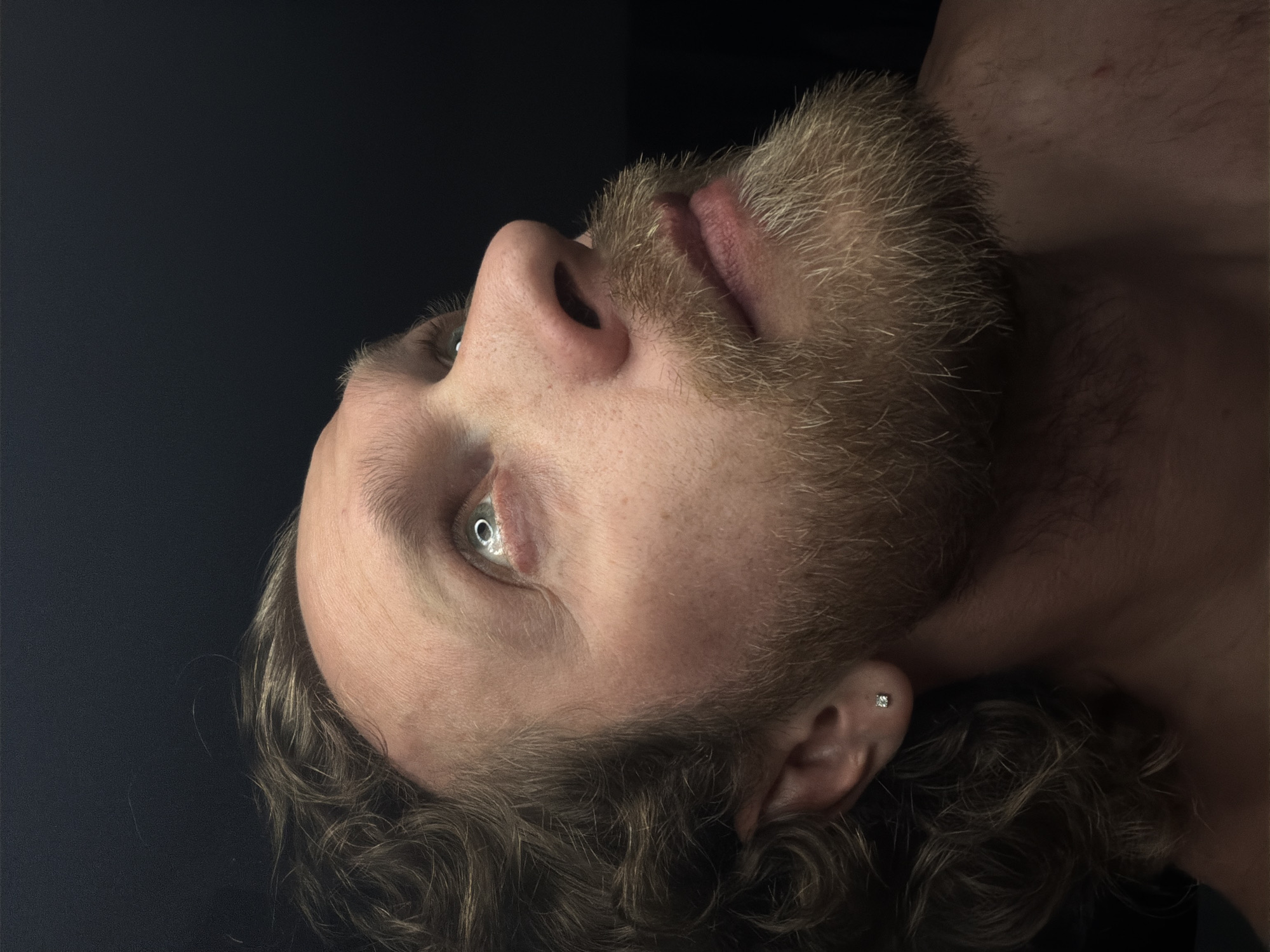 A close-up, low-angle shot features a man's face turned upwards against a dark background. He has a light complexion, with fair hair and a beard that is a mix of blonde and light brown. His eye, visible in the upper left, is blue. A small, square-shaped earring is visible in his left ear. The man's lips are partially visible. Part of his chest and neck are also visible. The setting or specific location of the image is not discernible.