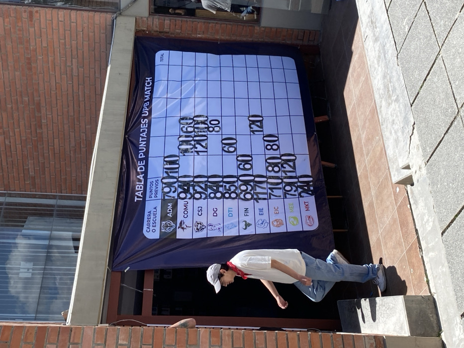 This image depicts an outdoor scene at the Universidad Privada Boliviana (UPB) campus in Achocalla, Bolivia. A large, dark blue banner titled "TABLA DE PUNTAJES UPB MATCH" (Scoreboard UPB Match) is prominently displayed, secured against a red brick building facade. The banner features a white grid with columns for "CARRERA O ESCUELA" (Career or School), "PUNTOS PREVIOS" (Previous Points), subsequent point columns, and a "TOTAL" column. Visible entries include various academic programs or schools such as ADM, COMU, CSJ, DG, DTI, FIN, EIE, EIC, MEE, and MKT, each accompanied by a logo and numerical scores (e.g., ADM with 790, COMU with 940, CSJ with 920). A male individual is positioned on the left, captured in motion while stepping down from an elevated doorway threshold. He wears a light grey baseball cap, a white short-sleeved t-shirt, light blue jeans, and white athletic shoes. A red bandana is tied around his neck. A partial view of an arm or shoulder belonging to another individual is visible within the dark doorway on the far left. On the far right, a faint reflection or partial view of another person or object is discernible in a glass door or window. The ground immediately in front of the banner and doorway is paved with light brown square tiles. Beyond this tiled area, a grey concrete sidewalk with a discernible seam is visible. A small concrete curb or raised edge separates the tiled area from the sidewalk. Overhead lighting casts distinct shadows across the ground, indicating a bright, clear daytime environment. A large window above the banner reflects a blue sky with white clouds.