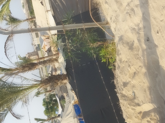 The image captures an outdoor scene in Deir el-Balah, Palestinian Territory, depicting a temporary encampment viewed from an elevated, sandy vantage point. The foreground consists of light-colored sand covering the lower third of the frame. A vertical grey metal pole is positioned slightly right of center, from which multiple horizontal strands of thin wire, possibly barbed, stretch across the mid-left portion of the frame. Green shrubbery and small plants are visible at the base of this pole and along the wire. Immediately behind the wire is a dark, solid barrier, appearing to be a black tarp or fabric. Beyond this barrier, a dense collection of light-colored canvas tents comprises a temporary settlement. Several of these tents are visible, with one in the mid-right exhibiting white lettering, partially decipherable as "AID." Interspersed among the tents are multiple tall palm trees with green fronds, extending upwards against a bright, clear sky. In the far background, several buildings, including one multi-story structure with distinct architectural features, are discernible under the clear sky. No individuals are visible in the scene. The natural lighting suggests daytime conditions.