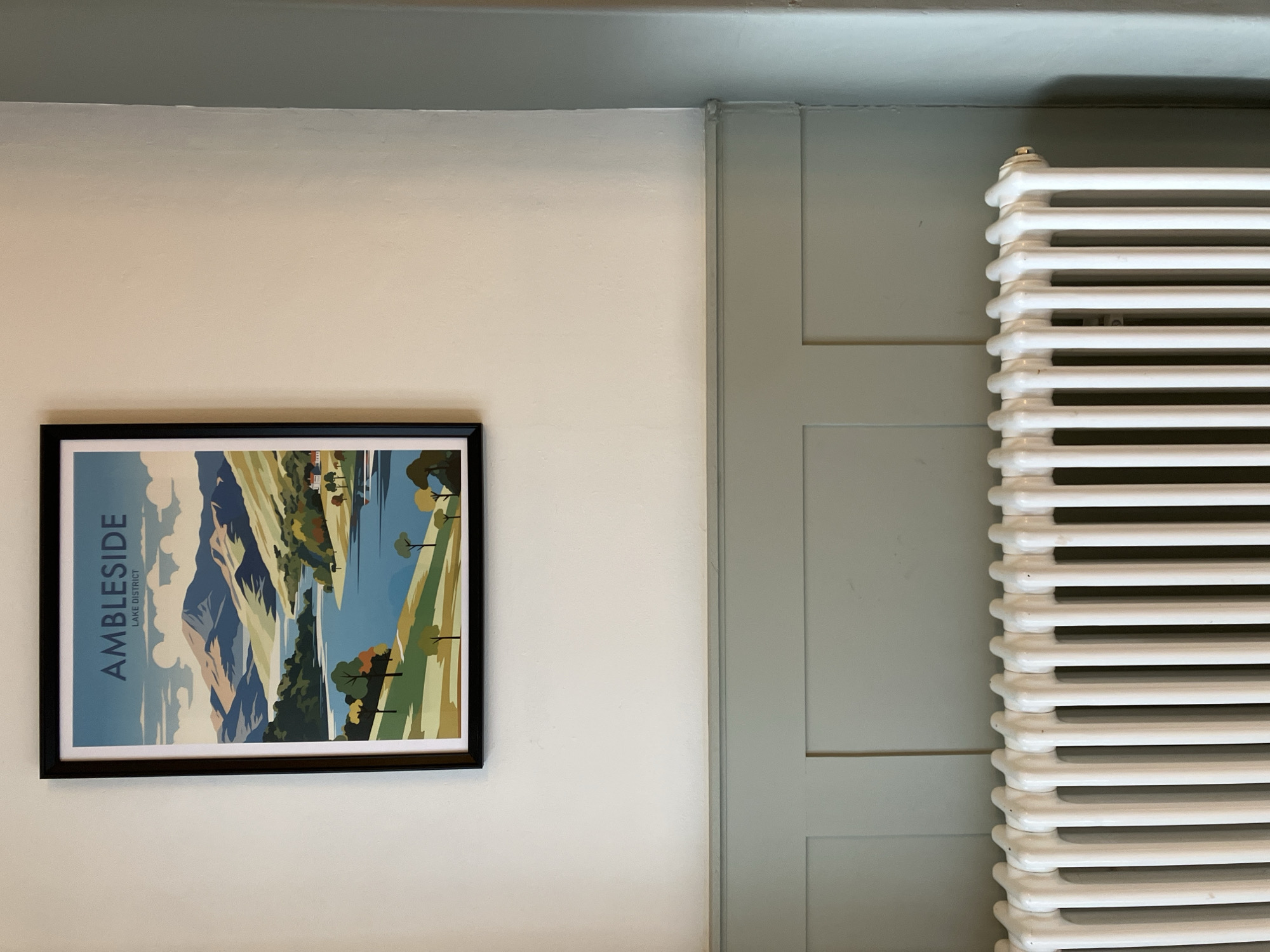 This image captures an interior wall within a building in Windermere, United Kingdom. The wall features a bipartite design: the upper section is painted a light off-white, and the lower section comprises a sage green wainscoting panel with a matching dado rail. A rectangular print, framed in thin black, is centrally mounted on the upper off-white wall. The print displays a stylized landscape illustration of "AMBLESIDE, LAKE DISTRICT," featuring a prominent blue lake, rolling hills, distant mountains in shades of blue and green, scattered trees exhibiting autumnal colors, and a small building with a red roof on the right shoreline. A traditional white multi-column radiator is positioned against the wall below the wainscoting. The wall on the right side of the frame forms an interior corner, painted a consistent sage green. No individuals or direct interactions are depicted.