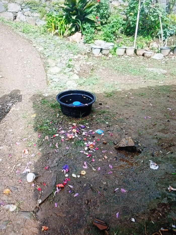 The scene depicts an outdoor ground area in Taungpi, Myanmar (Burma), under natural light. The ground consists of damp, dark earth, interspersed with patches of green grass, and a lighter-colored paved or concrete path along the left side. A distinct shadow, resembling a human profile, is cast on this paved section in the lower-left. A black, round plastic tub, approximately 40-50 cm in diameter, is centrally located on the ground. Inside the tub, a small, light-blue plastic object, possibly a bottle cap or stopper, is visible, along with other dark particulate matter floating on the surface of a liquid. Numerous flower petals are scattered extensively on the ground surrounding the tub and extending towards the foreground. These petals display a range of colors, including pink, red, purple, white, and yellow. Among the scattered petals and on the ground are various pieces of debris, including a crumpled white object, a blue plastic wrapper fragment, and multiple small stones. A larger, dark, angular rock is situated to the right of the main concentration of petals. In the background, a low stone wall supports dense green foliage, featuring large-leafed plants and some visible red flowers. Below the wall and to the right, a line of several light-colored, cylindrical pots, appearing empty or sparsely planted, is arranged on the ground. No people are visible within the frame.