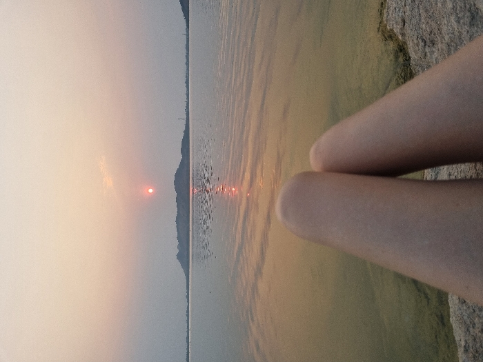 The image captures a sunset scene over a large body of water near Kammavaripalli, India. In the immediate foreground, the bare lower thighs and knees of a single individual are visible, resting on a textured, light-colored surface, which appears to be dry earth or rock. The legs are centrally positioned, angled slightly inward. Beyond the foreground, a calm body of water extends across the midground. A distinct reddish-orange sun is low on the horizon, slightly left of the image center, casting an elongated vertical reflection of light onto the water's surface. The distant background reveals a series of low-lying hills or mountains in dark silhouette along the horizon. To the far right, a thin, dark, vertical structure, consistent with a pole or tower, is discernible. The sky exhibits a hazy gradient of warm tones, including orange, pink, and light grey, characteristic of dusk. No other individuals or specific actions are depicted beyond the passive observation suggested by the first-person perspective.
