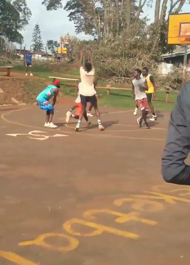 On an outdoor basketball court, several young men are playing basketball. They wear shorts and t-shirts, some in bright colors like orange and yellow. The court is a weathered, reddish-brown color with yellow markings. A yellow basketball hoop stands at one end. The basketball appears to be in the air, traveling toward the hoop. A man with dreadlocks, wearing a long-sleeved gray shirt, watches the game, standing at the edge of the court with his back to the camera. In the background, there are trees, a small building, a white car, and some benches. The sky is partly cloudy.