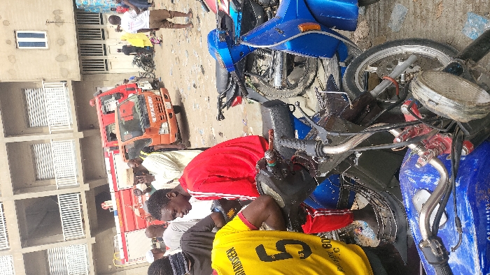 The image depicts an outdoor scene in Fagge C, Nigeria. The ground is unpaved, dusty, and contains scattered debris, including plastic bottles. In the background, a multi-story building of exposed concrete features multiple levels with white-railed balconies and horizontal window shutters. An adjacent building section to the right displays a window with vertical panes and a barred lower section. Emergency vehicles are present in the mid-ground. A large red fire truck is positioned behind a smaller orange Isuzu utility truck, which has "FIRE FIGHTING AGENCY" printed on its side. A gathering of approximately fifteen to twenty individuals, predominantly adult males, occupies the scene. Their attire varies from casual t-shirts and tracksuits to traditional garments. Key individuals include a young male in a red long-sleeved tracksuit top with white stripes, positioned in the mid-ground, and a male in a yellow t-shirt with a black "5" and "ARABDEEN" on its back, visible in the left foreground. A man in light-colored traditional wear and a cap is observed using a mobile phone. A woman in a yellow head covering is visible in the further background. Several motorcycles and scooters are present in the foreground and mid-ground. A blue motorcycle, with its handlebars, headlight, and front disc brake visible, occupies the immediate foreground. Another blue scooter is positioned to its right. Some of these two-wheeled vehicles appear damaged or partially disassembled. The individuals are gathered and observing the visible scene.
