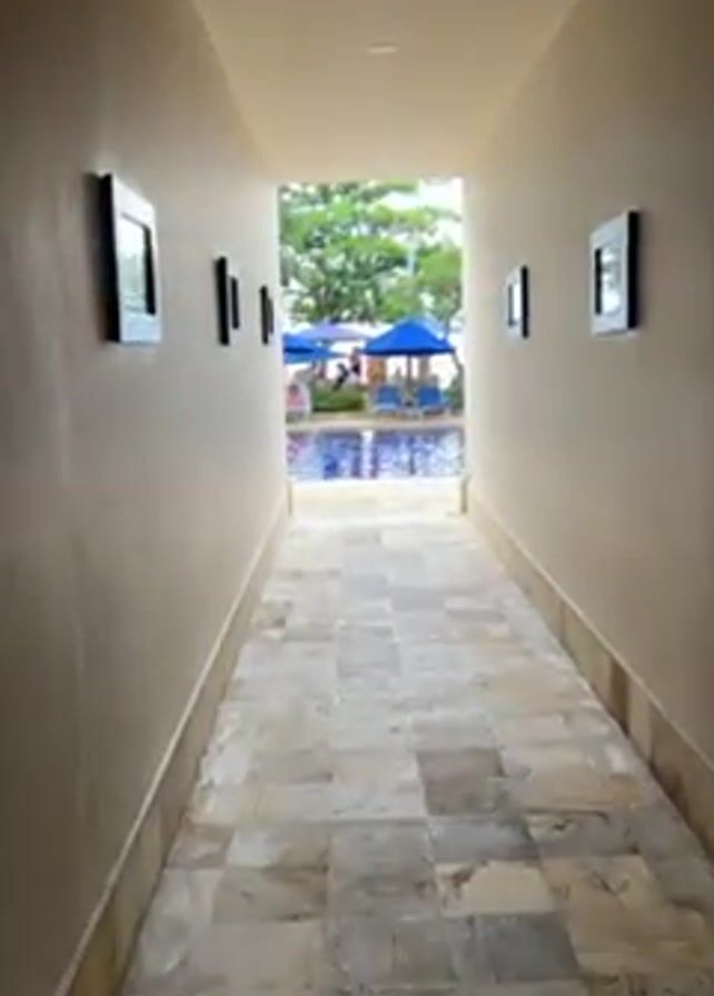 tiled hallway lined with framed pictures on both sides. The hallway leads to an outdoor swimming pool area with blue umbrellas, lounge chairs, and people relaxing. Some people are in the pool. The sky is overcast.