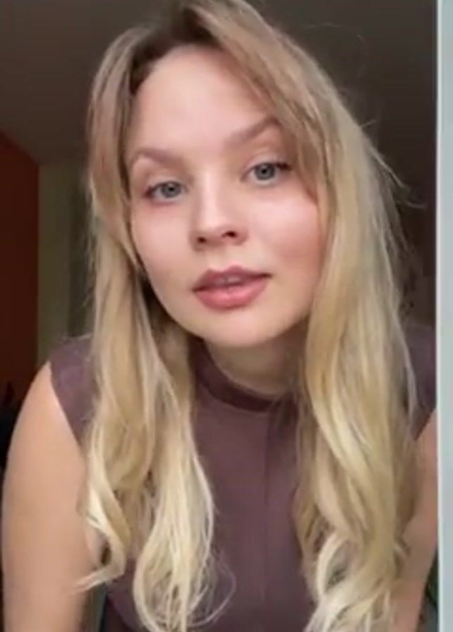 A woman with blond shoulder-length wavy hair and bangs is standing indoors, looking at the camera