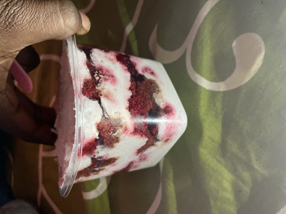 - "The scene depicts a clear, square-shaped plastic cup containing a layered dessert, held by a dark-skinned hand in the upper right quadrant of the frame" by FM-eIoso2, licensed under CC BY 4.0