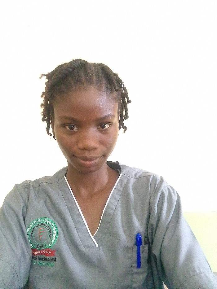 A female individual with dark skin and dark braided hair (dreadlocks) is depicted in a chest-up portrait. She wears a grey V-neck scrub top with white trim along the neckline. On her left chest, an embroidered circular patch with green and red elements and white text is visible, partially obscured but appearing to reference "HEALTH" and "COMMUNITY." A blue ballpoint pen is clipped into a utility pocket on her right chest. The individual looks directly at the camera with a neutral to slight smiling expression. The background is a plain, light-colored wall, predominantly white, with a vertical line on the right suggesting a corner, and a small, faint yellowish section further to the right. The scene is an indoor setting in Unknown, Unknown.