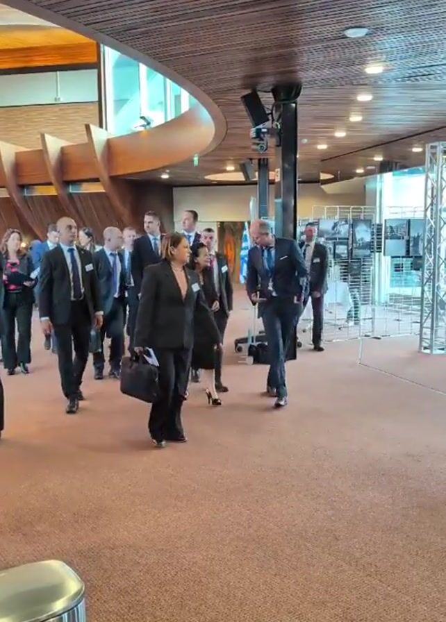 In an indoor setting with a unique wooden ceiling, a group of approximately 15 individuals is walking towards the camera. Most of them are wearing formal business attire, consisting of suits for men and suits or professional outfits for women. The individuals are walking on a large, carpeted floor that appears to be tan or light brown in color. To the right of the group, there is a display with photos or images on stands, marked with the words "Media Box." Overhead, there's a security camera and modern lighting fixtures. The scene gives the impression of a professional conference or business event.
