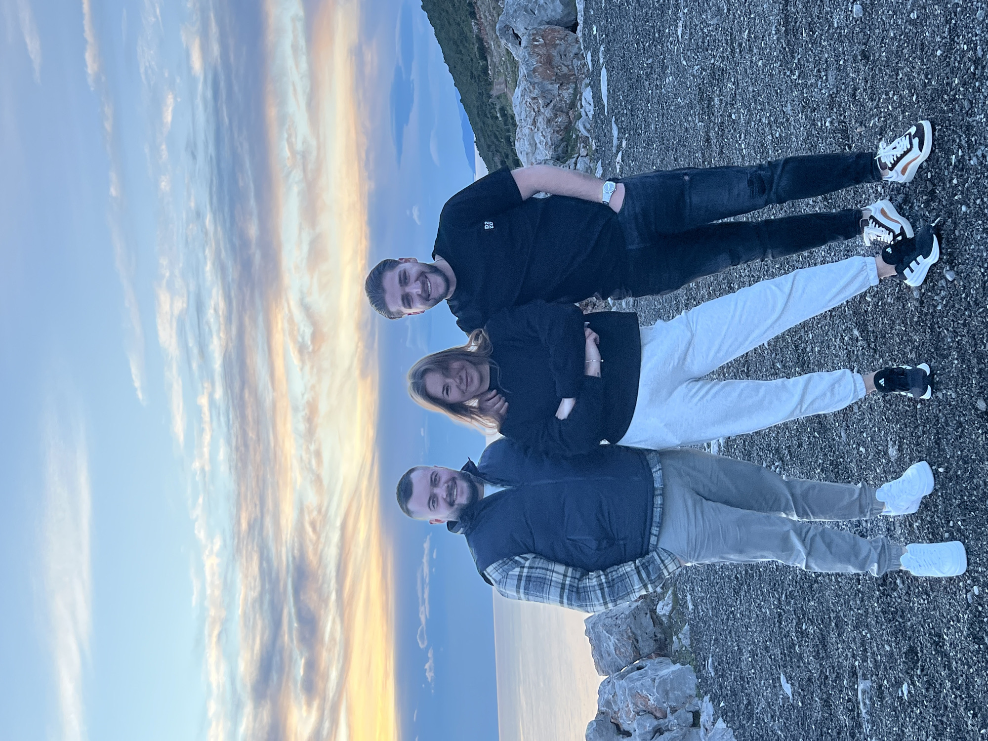 Three people are standing on a rocky cliff with a body of water and a colorful sunset sky in the background