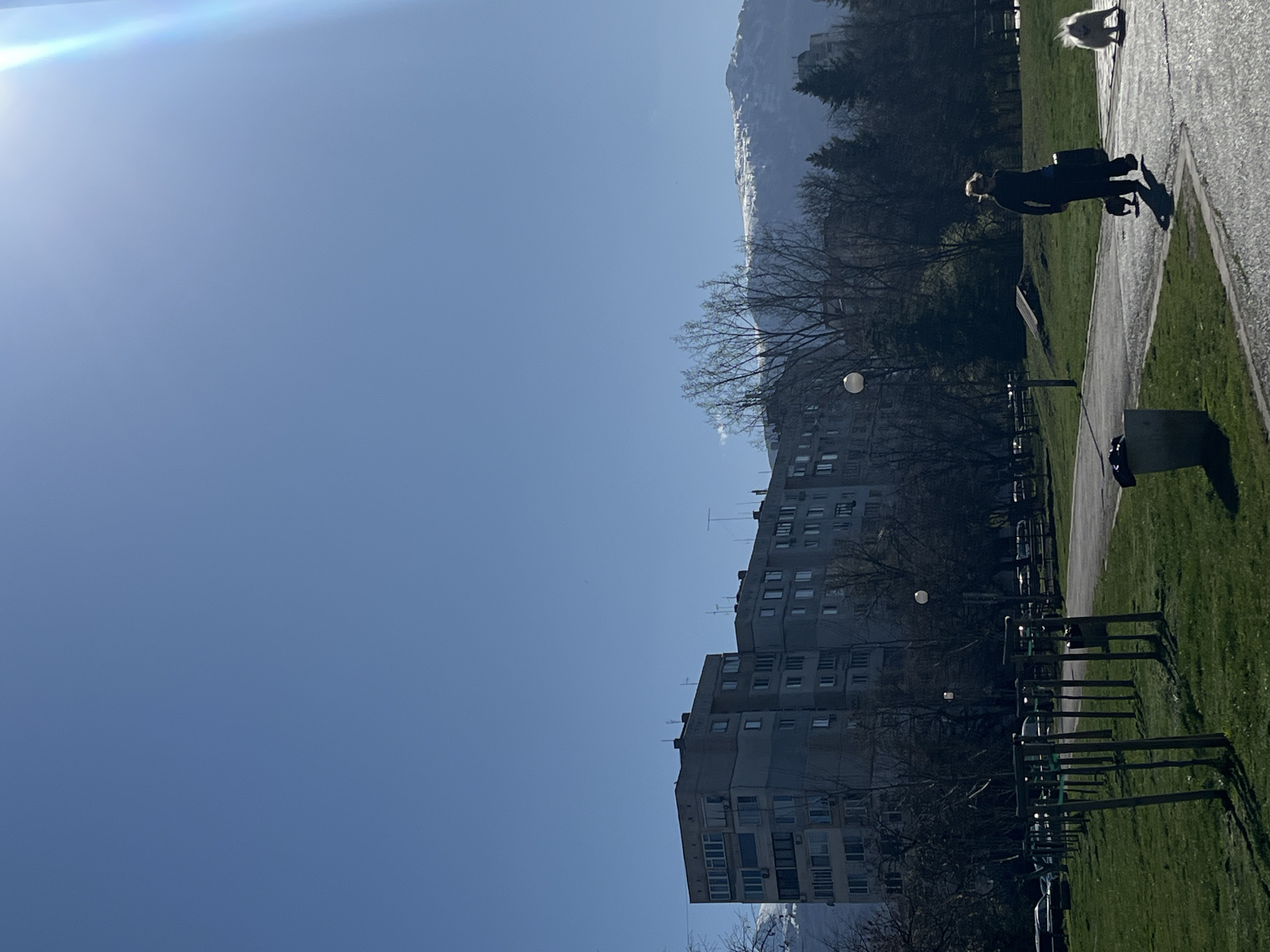 The image depicts a sunny, outdoor scene in Sofia, Bulgaria, characterized by a blend of urban and natural elements. The sky is clear and blue with a bright glare in the upper left corner, suggesting direct sunlight. In the lower part of the image, a large, gray apartment building dominates the middle ground. Its façade features multiple windows and satellite dishes on the roof. The building is positioned next to a park area. The park consists of green lawns and a paved pathway where a person is walking a small white dog. Trees with bare branches are scattered throughout the park, indicative of late fall or winter. Additionally, there's a wooden fence or railing separating the park from the road. In the background, snow-capped mountains are visible, providing a picturesque backdrop to the urban landscape. The overall scene suggests a cold and sunny day in a residential part of Sofia.