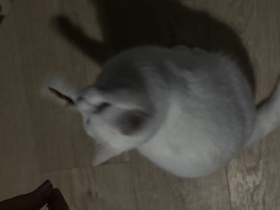 The image displays an indoor scene in Dobri dial, Bulgaria. A white domestic cat is positioned on a light-colored wooden floor, its body oriented towards the center-left. Its head is turned sharply upwards and to the right, exhibiting motion blur, indicating active engagement. The cat appears to be interacting with a small, elongated object featuring a feathery or fibrous tip, which is being held by a human hand. The human hand is partially visible in the upper-left corner of the frame, showing light-toned skin and light-colored nail polish on the visible fingernails. Dim lighting conditions are evident, casting a prominent, elongated shadow of the cat to the right of its body. The background is dark and indistinct, while the foreground shows a consistent pattern of light wood planks.