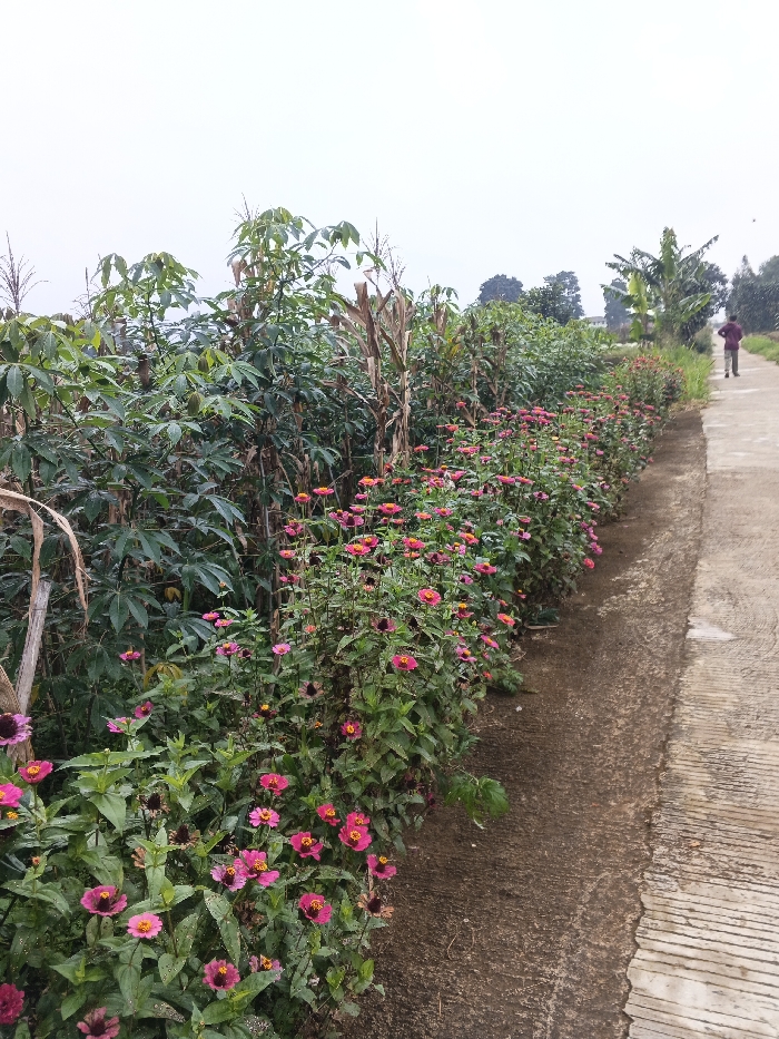 A rural scene showcases a concrete path bordering a vibrant flowerbed of pink Zinnias. Behind the flowers, lush green cassava plants mix with drying corn stalks. In the distance, a person walks along the path towards the right, under a cloudy sky. Patches of taller trees further back create a natural backdrop to the agricultural setting.