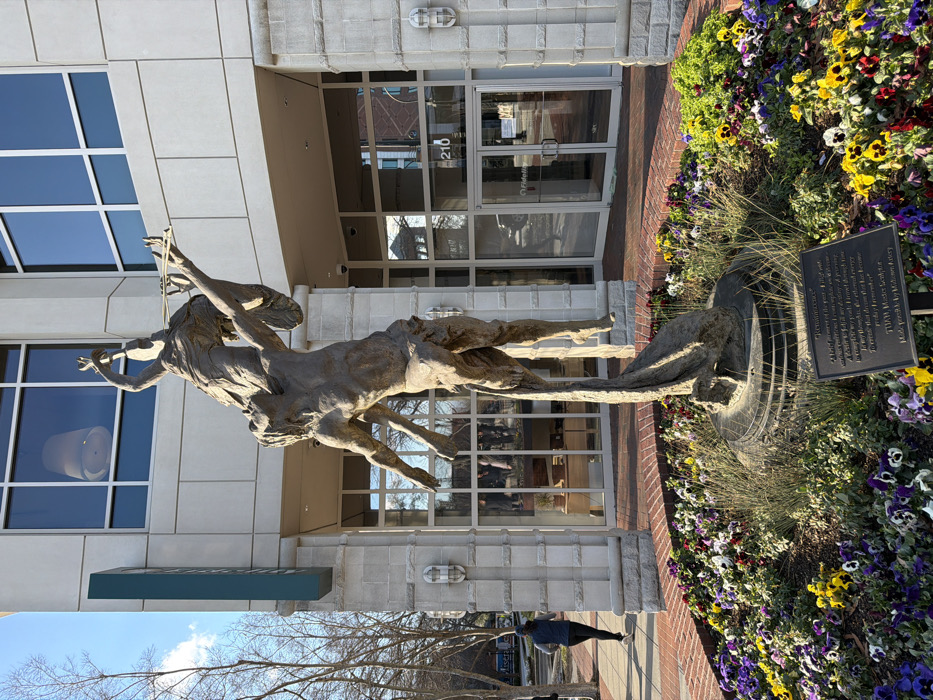 A bronze sculpture depicts a horse-like figure carrying a person playing a violin. The sculpture stands outside a modern building with large windows and a glass-door entrance marked "210." The sculpture is placed among colorful flowers. A plaque sits beside the sculpture, detailing the art piece and its contributors. A person is walking on the sidewalk.