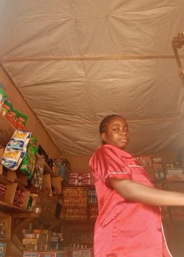 The video features a young woman standing inside what appears to be a small shop or booth