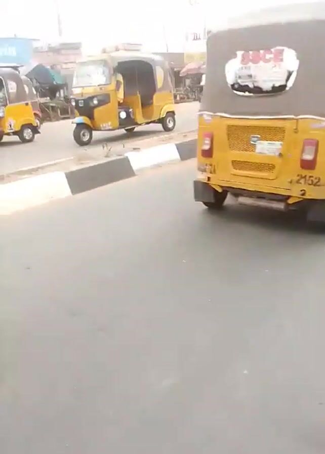 view from inside a yellow motorized tricycle (also known as a "Keke Napep") as it travels along a paved road