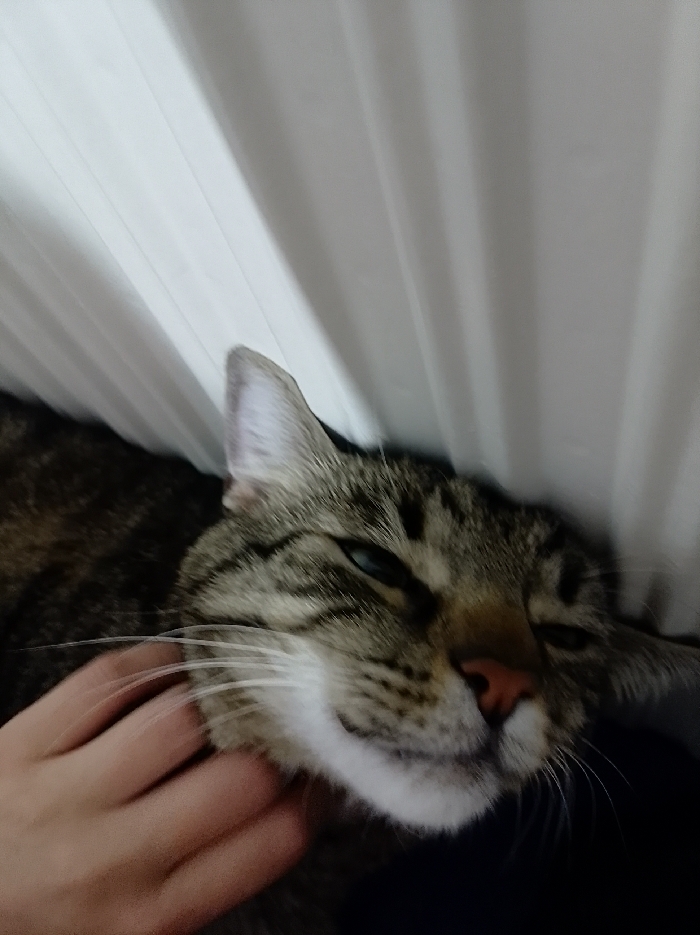A tabby cat is lying down with its eyes partially closed. The cat's head is the primary focus, showing brown, grey, and black markings on its fur. A hand is gently stroking the cat's cheek. The cat has a pink nose, white whiskers, and its ear is visible in the upper left. The background consists of vertical white blinds or a curtain, adding a simple contrast to the cat's warm tones. The scene conveys a sense of comfort and affection.