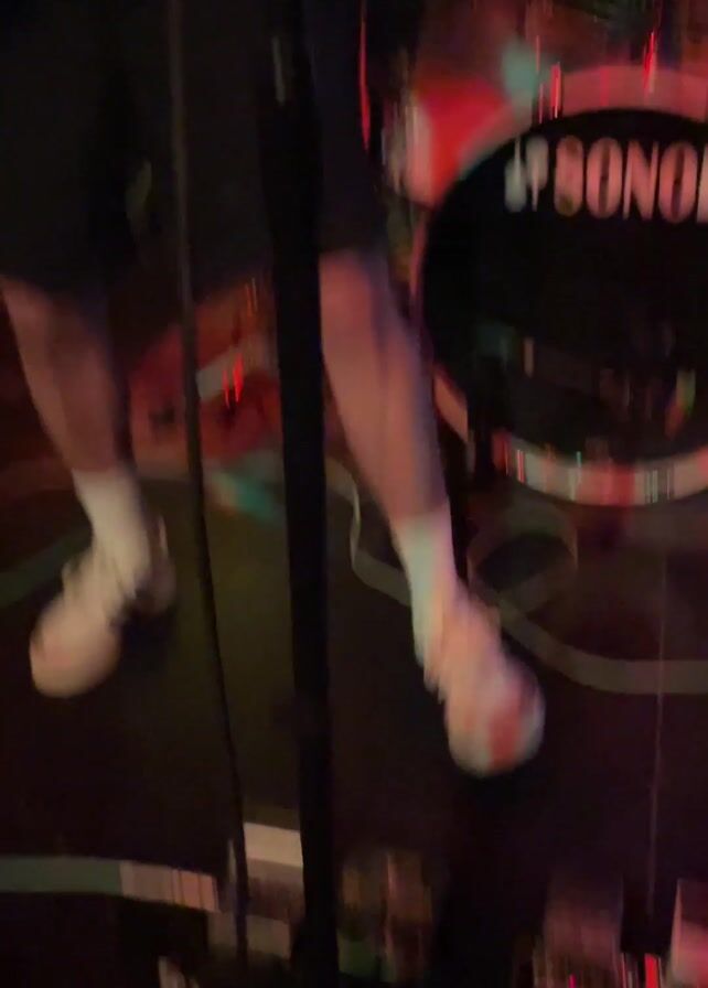 guitarist performing on stage. The camera starts with a close-up of the floor where various guitar effects pedals, a water bottle, and the artist's sneakers are visible. The camera then pans up to reveal the guitarist. He has long brown hair and a beard, wearing a black t-shirt and shorts. He is playing a light blue guitar with visible wear and tear. The background features posters on the wall and a drum set. He sings into the microphone while playing.