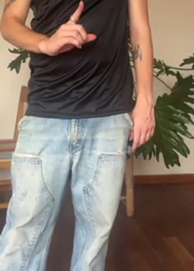 A person wearing a black sleeveless athletic shirt and light blue jeans stands in front of a Monstera plant on a wooden floor. The person's left hand is gesturing. In the background, a wooden chair with a colorful woven cushion is visible. The scene appears to be indoors with natural light.