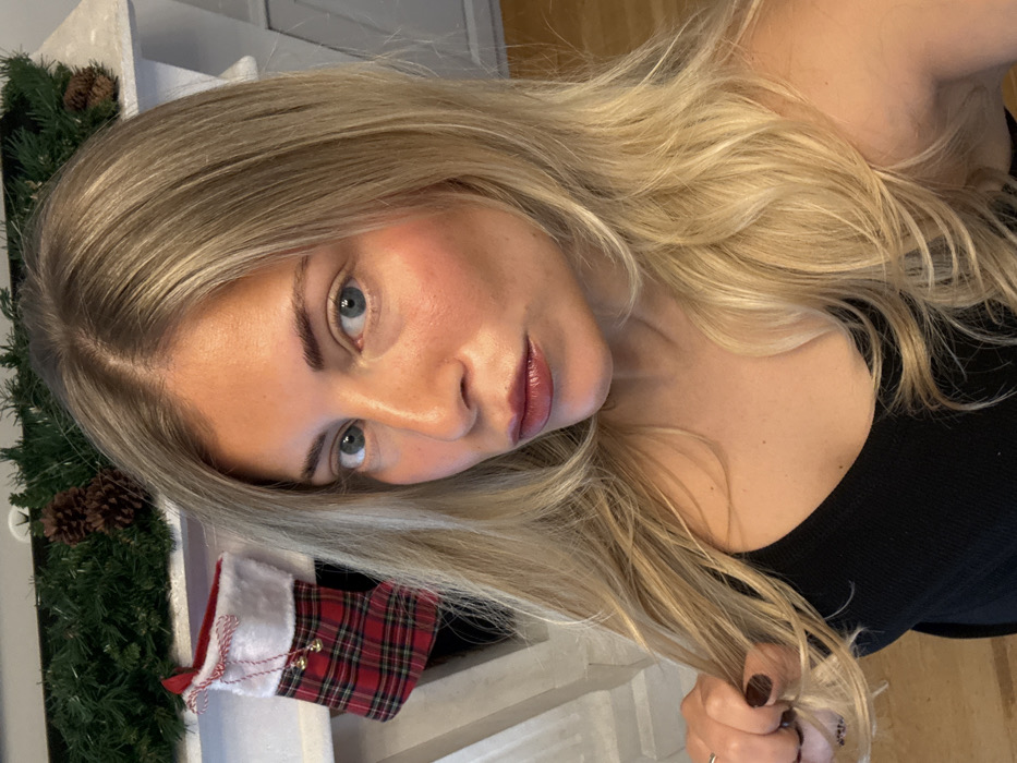The image displays a close-up, eye-level self-portrait of a female subject, identified as being in an indoor setting within Rueil-Malmaison, France. The subject has long, layered blonde hair with a center part and blue eyes. She wears a black tank top. Her right hand is visible in the lower-left quadrant, holding a section of her hair; the fingernails are painted dark, and a silver-toned ring is present on her ring finger. Her lips exhibit a dark, glossy cosmetic application, and her cheeks show a reddish tint, consistent with blush or bronzer. The background features a white fireplace mantelpiece, positioned horizontally across the upper third of the frame. This mantel is decorated with green artificial pine garland and brown pinecones. A red and black plaid Christmas stocking with a white cuff and small gold bells hangs from the left side of the mantel. A light brown wooden floor is discernible in the lower-right portion of the image.