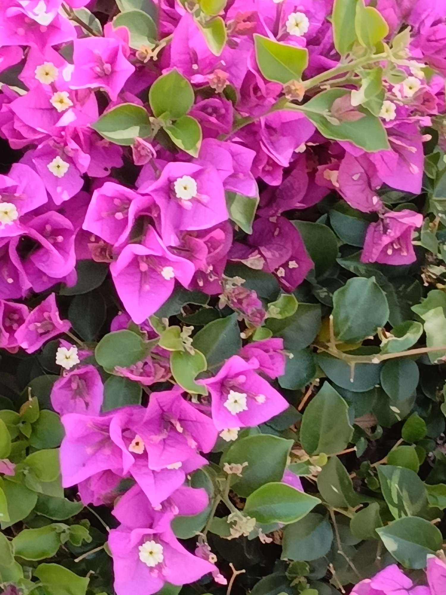 The scene, located in East Los Angeles, United States, displays a dense, close-up view of a blooming bougainvillea plant