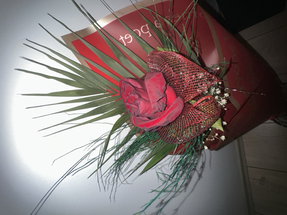 - "The image displays a floral bouquet featuring a single, prominent deep red rose, which exhibits a somewhat dried or wilted appearance with visible petal texture" by FM-sTvb12, licensed under CC BY 4.0