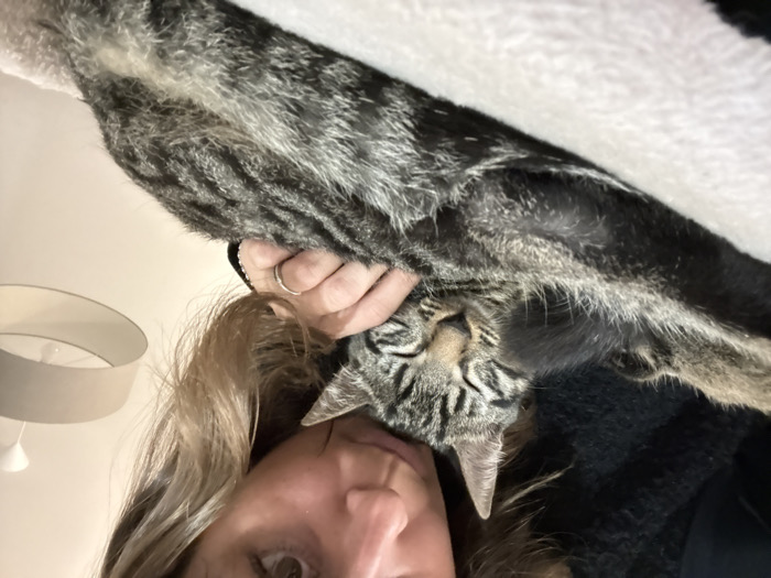 - "The photo depicts a woman holding a tabby cat upside down, close to her face" by FM-CYJaF3, licensed under CC BY 4.0
