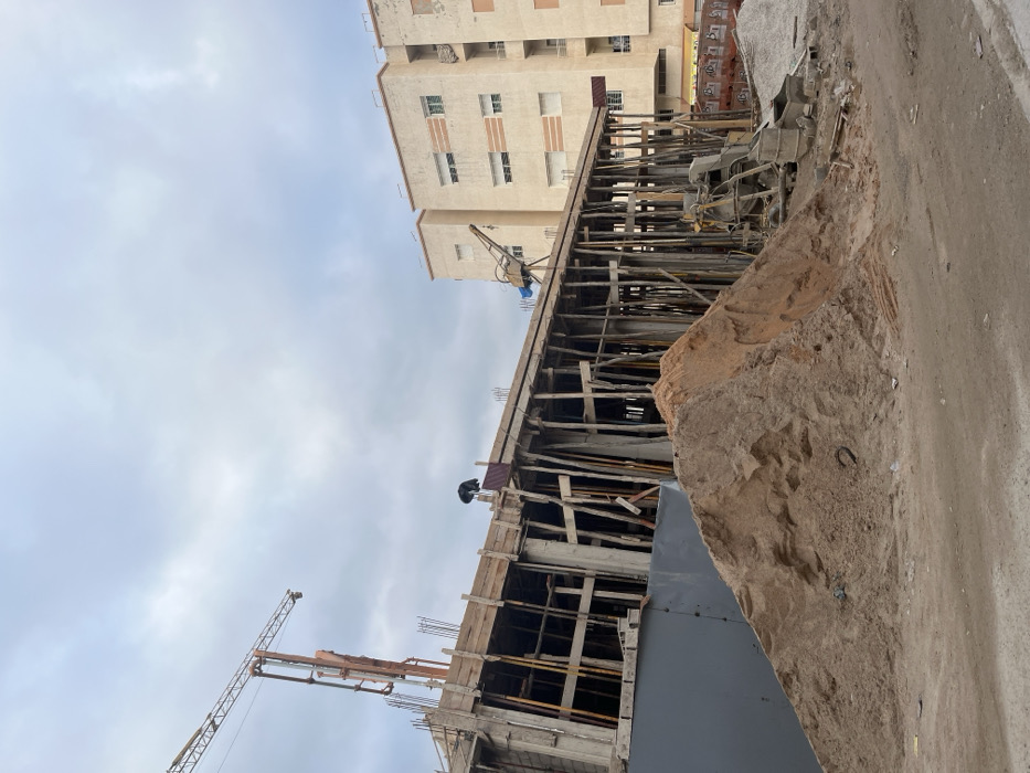 A construction site features a building under construction with exposed wooden supports and rebar