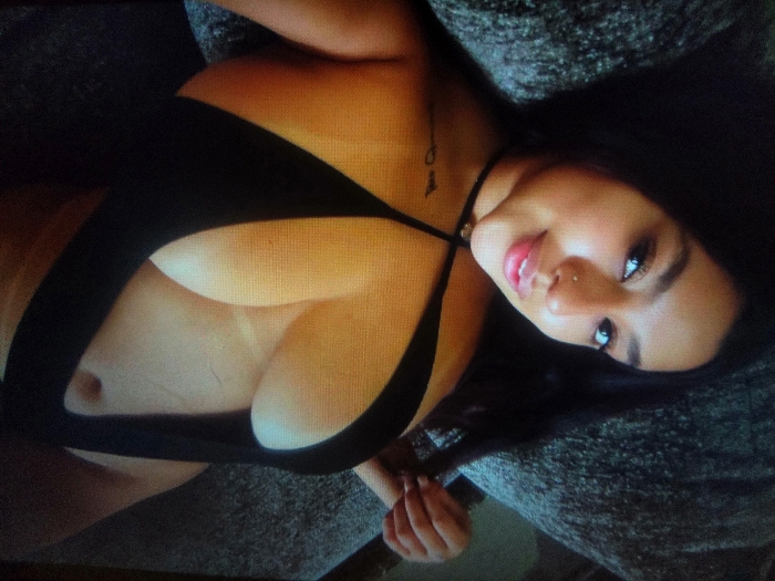 A woman with dark hair and fair skin is lying on a textured surface. She is wearing a black halter top that reveals cleavage. She gazes upward with blue eyes. Her lips are full and pink, and she has a nose piercing. A thin black choker adorns her neck. A delicate tattoo is visible on her upper chest. She is holding an object in her right hand.