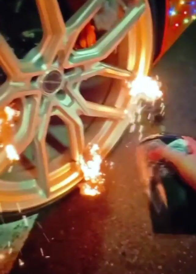 car decorated with colorful Christmas lights driving on the road. The wheels are rigged to produce sparks, creating a light trail as the car moves. The overall scene is festive and visually striking.