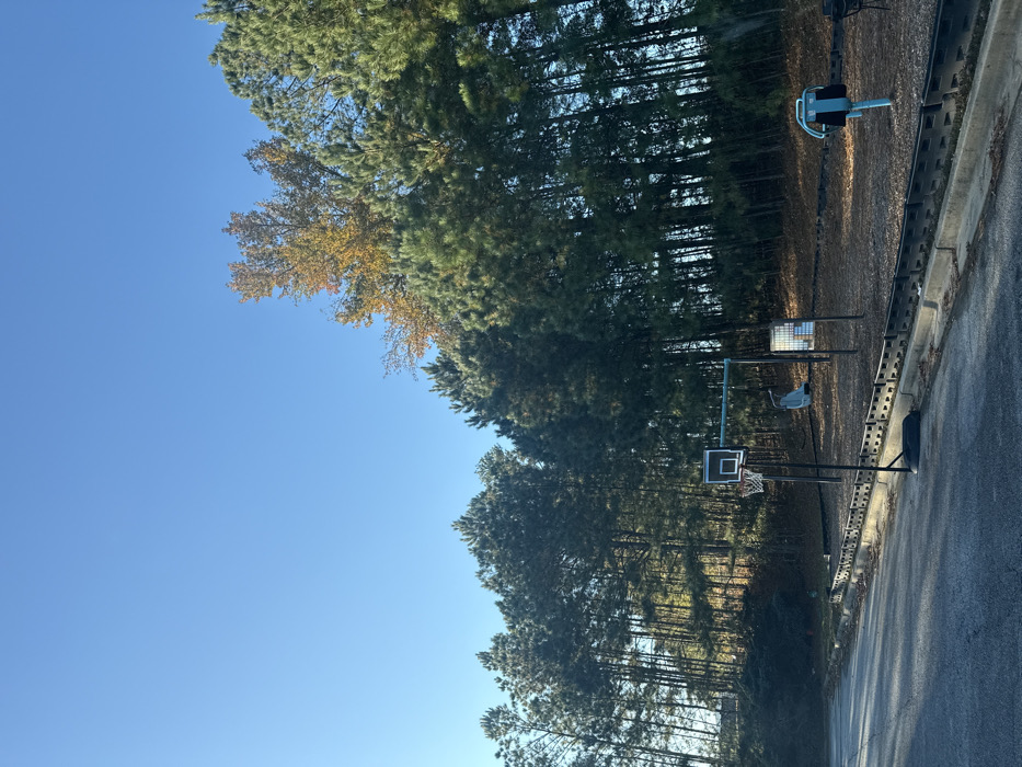 The image depicts an unoccupied outdoor recreational area in Loganville, United States, viewed under a clear, bright blue sky. A dense line of tall evergreen trees forms the background, with one prominent deciduous tree displaying yellow and orange foliage visible toward the upper right among the evergreens. In the foreground, a paved surface, consistent with an asphalt road or parking area, runs along the left. Adjacent to this paved area, a low, dark-colored barrier separates it from an unpaved section covered in dry leaves and dirt. Within this unpaved area, a portable basketball hoop with a black pole, square backboard, and white net is positioned, its dark base resting on the paved surface. To its right, a teal-colored metal frame supports a single blue-grey swing seat. Further to the right, a rectangular sign or information board is visible, and in the far right mid-ground, a light blue outdoor fitness machine is present. No individuals or animals are visible, and no specific actions or interactions are occurring within the scene. The lighting indicates clear weather, possibly morning or late afternoon.