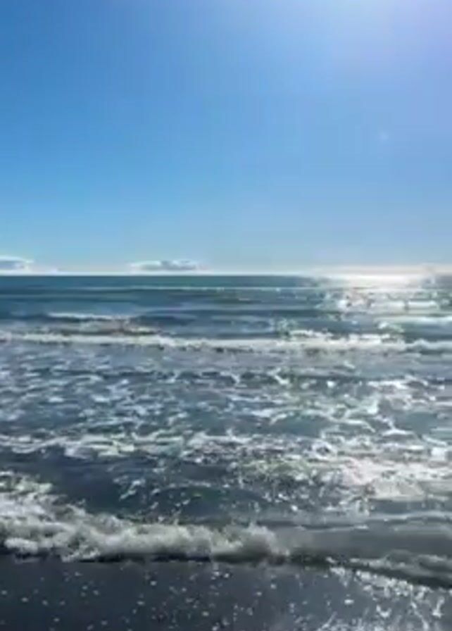 bright, sunny day at the beach. The sky is a vibrant blue with a few wispy clouds near the horizon. The ocean water is a deep blue-grey, with white foam from the waves. The waves are relatively small, rolling in gently towards the shore. The sand on the beach is a dark color, possibly grey or black. There are a few pieces of driftwood scattered along the shoreline. The sun is shining brightly, creating a glare on the water's surface.