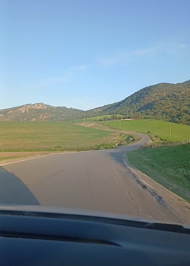 drive on a rural road towards a herd of sheep. The road curves gently through green, grassy fields dotted with utility poles. In the distance, there are low, rolling hills covered with trees and shrubs. The sky is clear and blue with just a hint of clouds. As the car approaches the curve, a shepherd standing near the sheep becomes visible. The view is from inside the car, with the dashboard partially visible.
