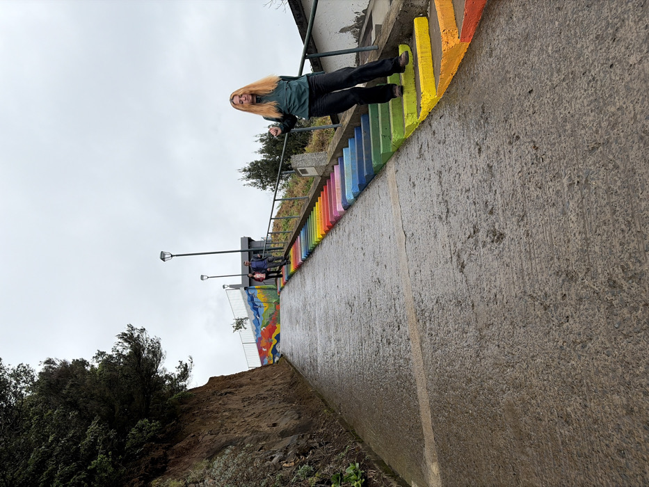The image displays an inclined outdoor pathway in Santana, Portugal, under an overcast sky. A concrete ramp occupies the left side, bordered by a retaining wall topped with dense green foliage. To the right of the ramp, a set of concrete stairs descends, each step painted in a vibrant rainbow gradient, progressing from red/orange at the lowest visible steps to yellow, green, blue, and violet further up. A metal handrail runs alongside the right edge of the stairs. In the midground, a colorful mural depicting a landscape is visible on a wall at the upper end of the incline, flanked by two black streetlights. All concrete surfaces appear damp. Three individuals are present, all descending the stairs. In the foreground, a female with long, reddish-blonde hair, dressed in a dark green hooded jacket and dark pants, is stepping onto a yellow-painted stair, her right hand slightly raised. Further up the stairs, in the midground, two additional individuals are descending. The person on the left wears a reddish-pink jacket, and the person on the right wears a grey/blue jacket. No direct interaction between the subjects is evident.
