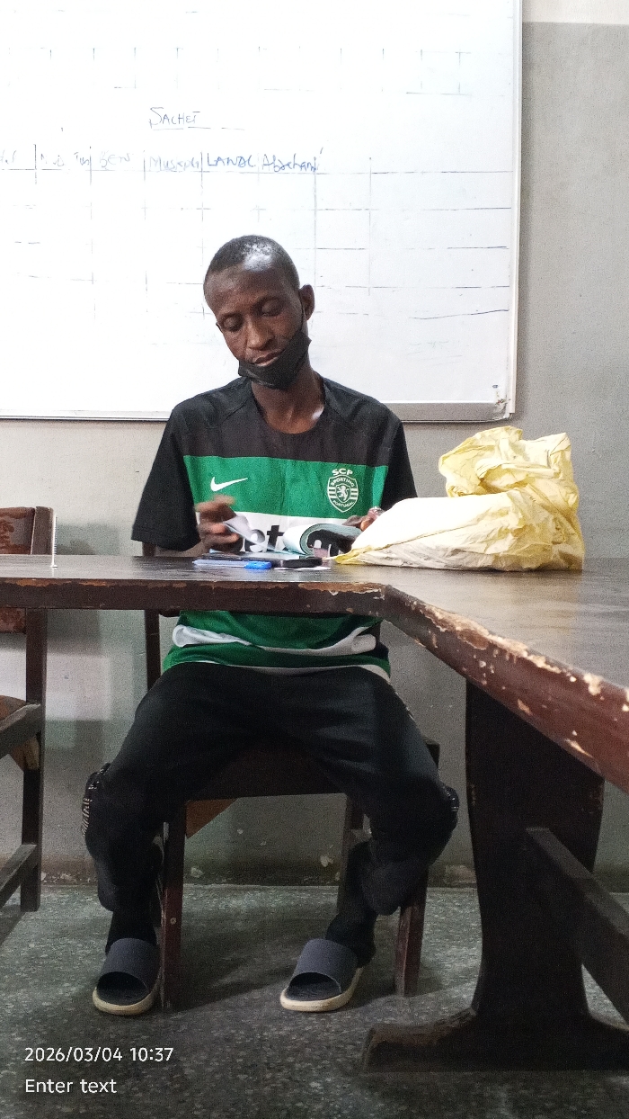 A male individual is seated at a worn, dark brown wooden table within an indoor setting in Dakata, Nigeria