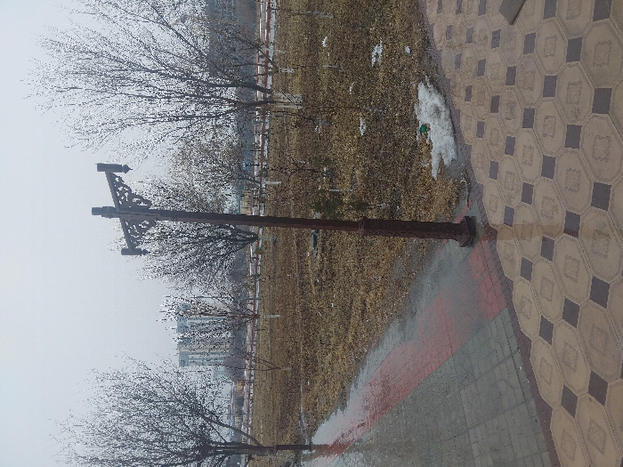 A brown lamppost with decorative elements stands on a wet, patterned walkway. Behind it, a field of dry grass stretches out with a few trees and patches of snow visible. A building is visible in the distance through the trees. The sky is overcast and gray.